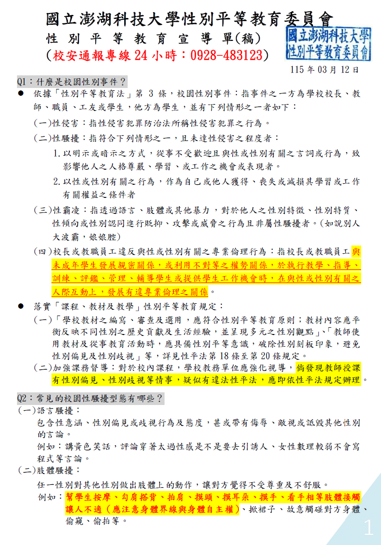 性別平等教育宣導單(通報請逕洽校安專線24小時專線:0928-483123)