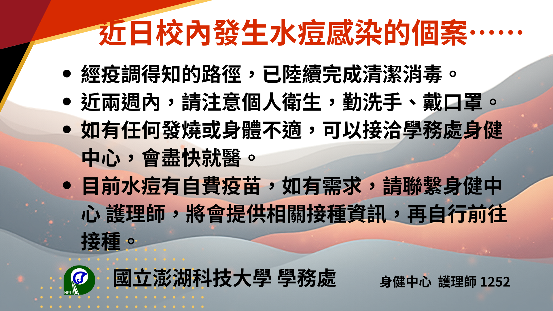 本校目前出現水痘個案,已展開個案及接觸者疫調及校園清消,水痘感染力強,請師生務必注意自身衛生習慣,注意是否有發燒及紅疹的症狀。