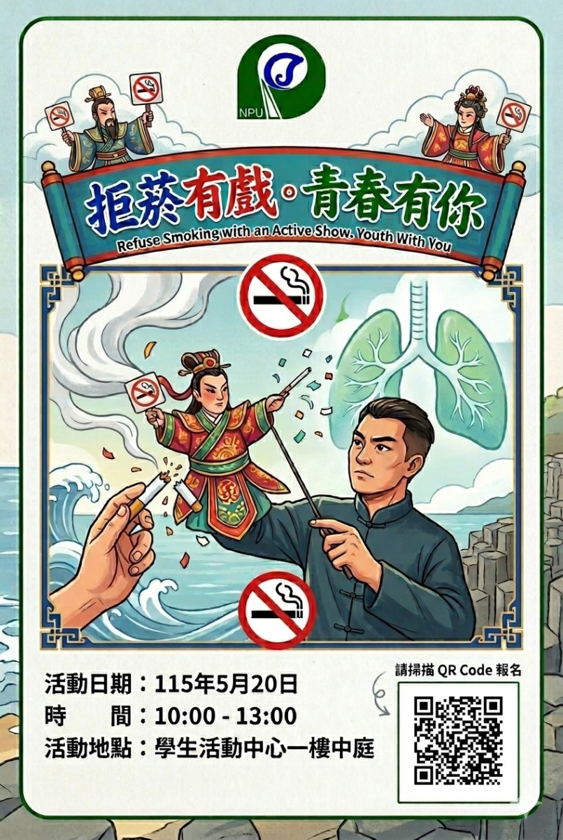 5/20辦理拒菸有戲青春有你活動-10:00-13:00學生活動中心一樓中庭~歡迎踴躍報名。