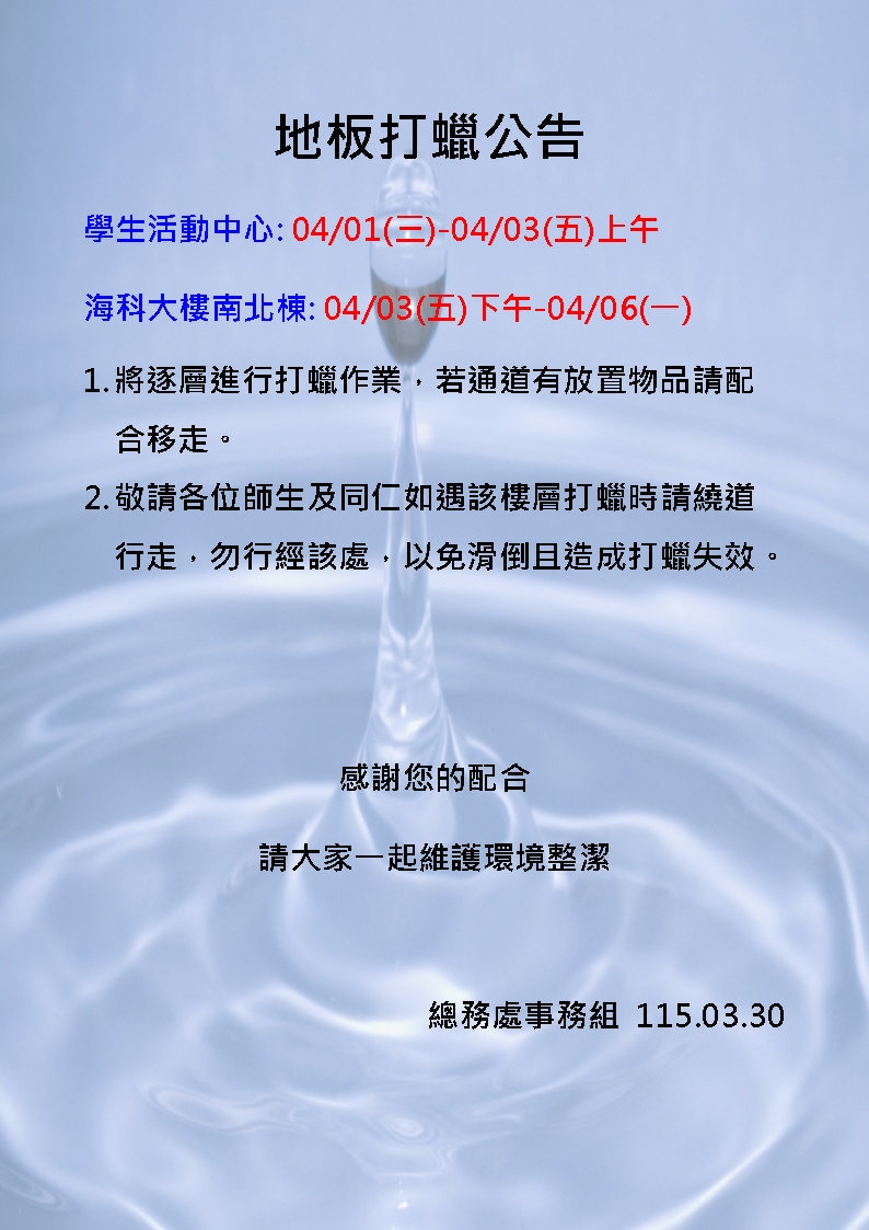 【通告】4/1-4/6學生活動中心及海科大樓南北棟進行打蠟作業
